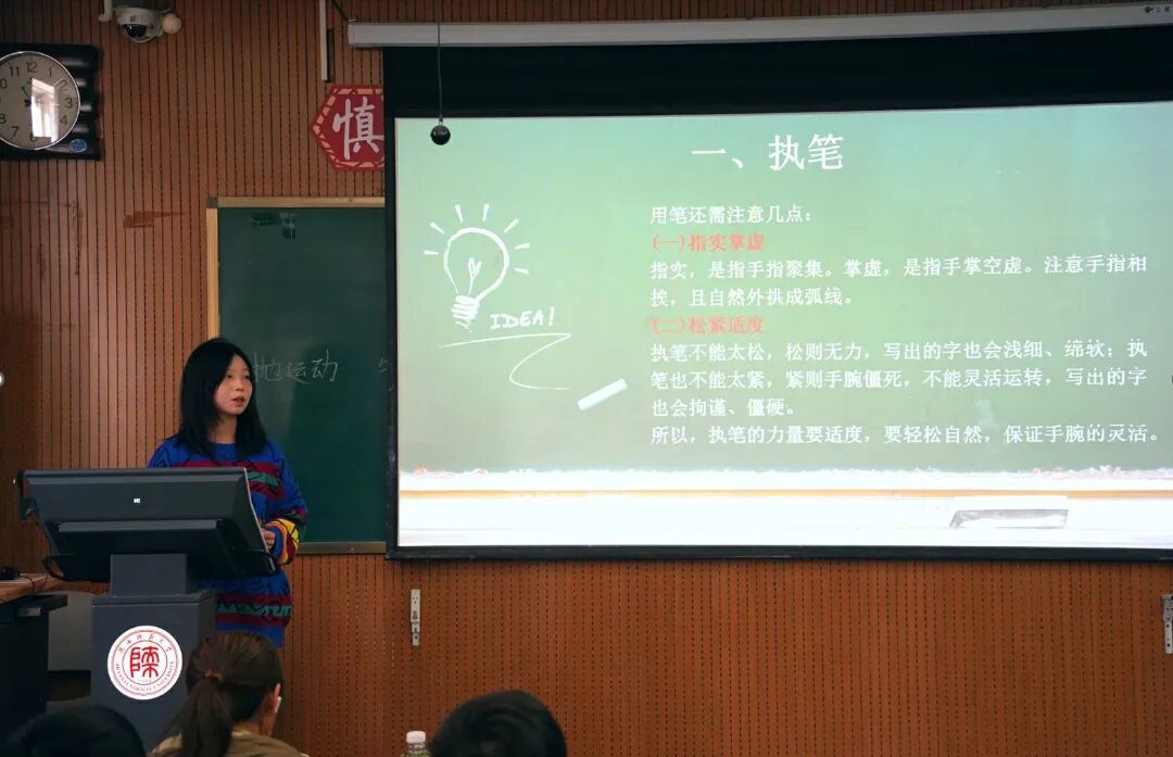 11月1日,第一场分享会于雁塔校区教学四楼4301教室如期举行。高禾翎同学进行了黑板字书写技巧分享。她邀请现场同学上台书写,针对性地指出了其书写中存在的错误与不足,随后高禾翎同学进行正确写法示范,详解黑板字书写的笔画、结构要点。最后,她对大家提出专业练习建议,助力同学们规范书写习惯、提升书写水平,通过实操点拨与精准指导,帮助大家夯实教学技能基础。