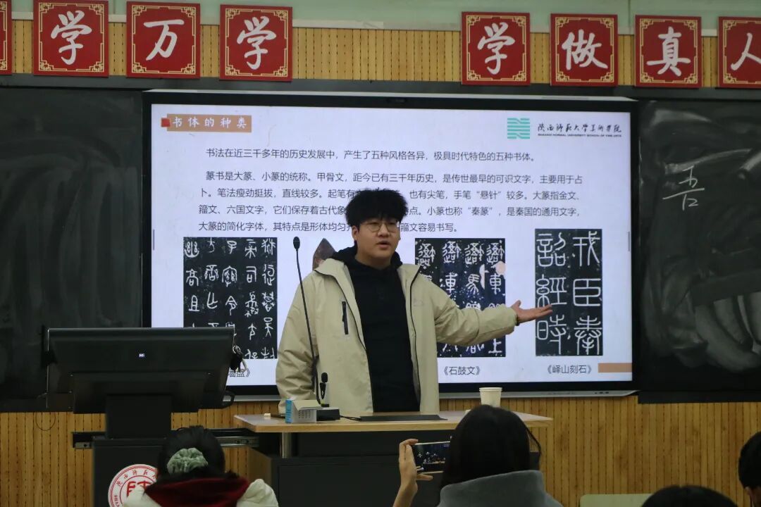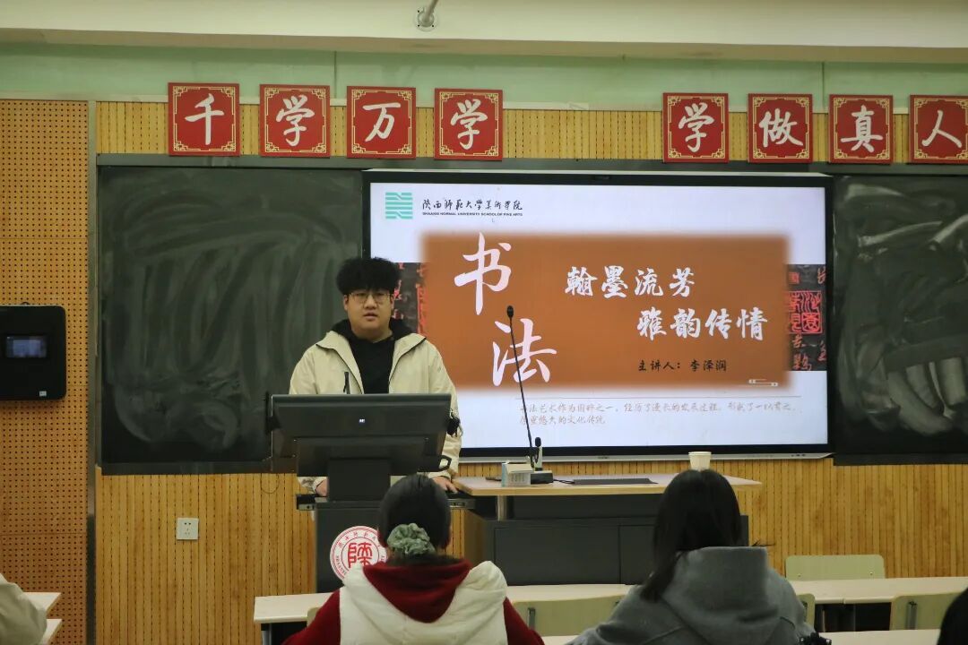 11月8日,李泽润同学在雁塔校区教学八楼8207教室为同学们带来了第二场分享会。他生动追溯了书法的起源与发展脉络,让大家对毛笔字建立起更全面立体的认知。随后,李润泽同学以幽默风趣的语言,详细拆解了毛笔字的运笔精髓与粉笔字的力度把控技巧,枯燥的知识点变得鲜活易懂,让大家沉浸式体验到书法艺术的独特魅力。此外,他还深入分享了书法作品的鉴赏思路,引导大家学会从笔法、结构、气韵等多个角度,去欣赏和评价书法作品的美感与内涵。