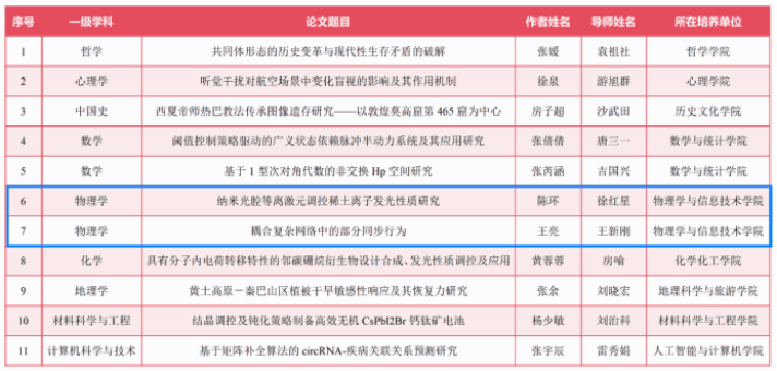 据陕西省学位委员会、陕西省教育厅公示的2025年省级优秀博士学位论文评审结果,我院陈环博士学位论文《纳米光腔等离激元调控稀土离子发光性质研究》、王亮博士学位论文《耦合复杂网络中的部分同步行为》获评2025年陕西省优秀博士学位论文。这是我院2025年2人次获得陕西省优秀博士学位论文。