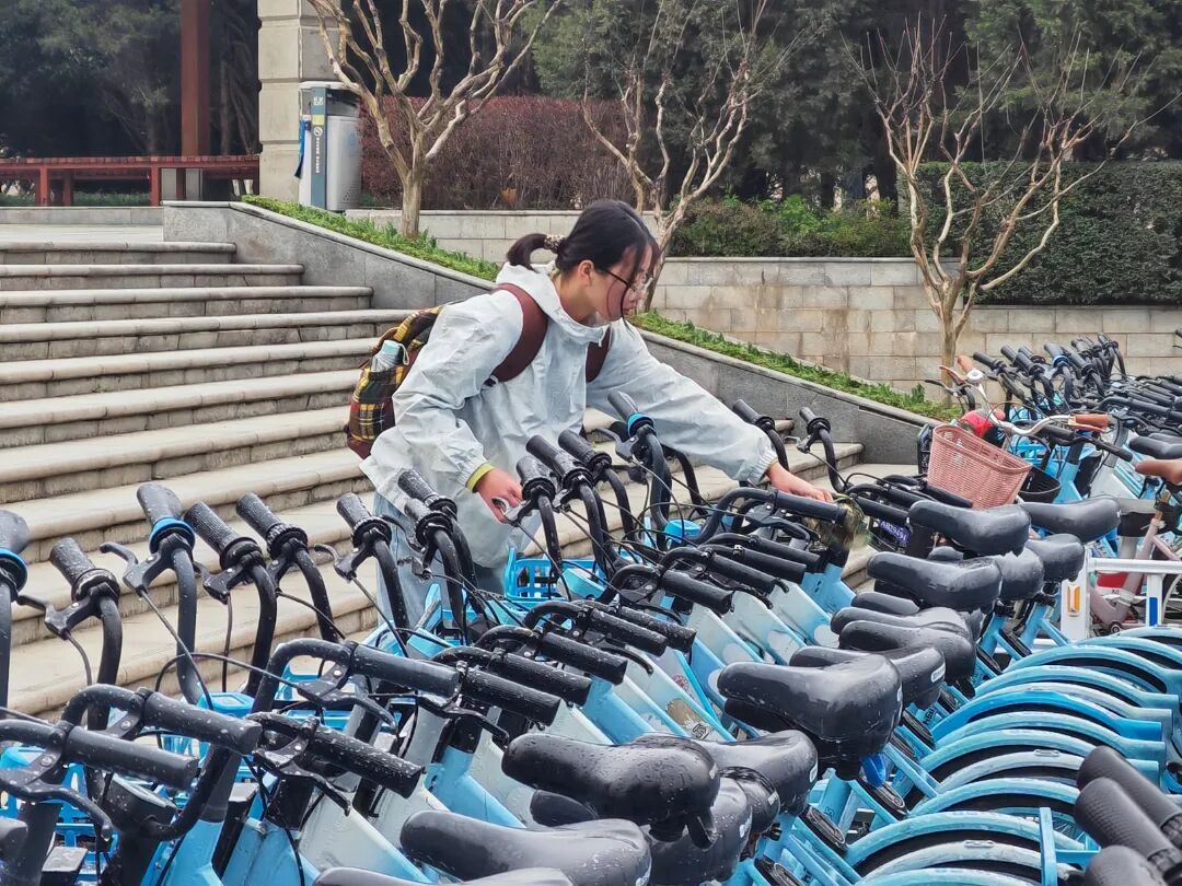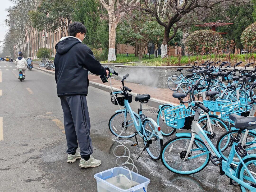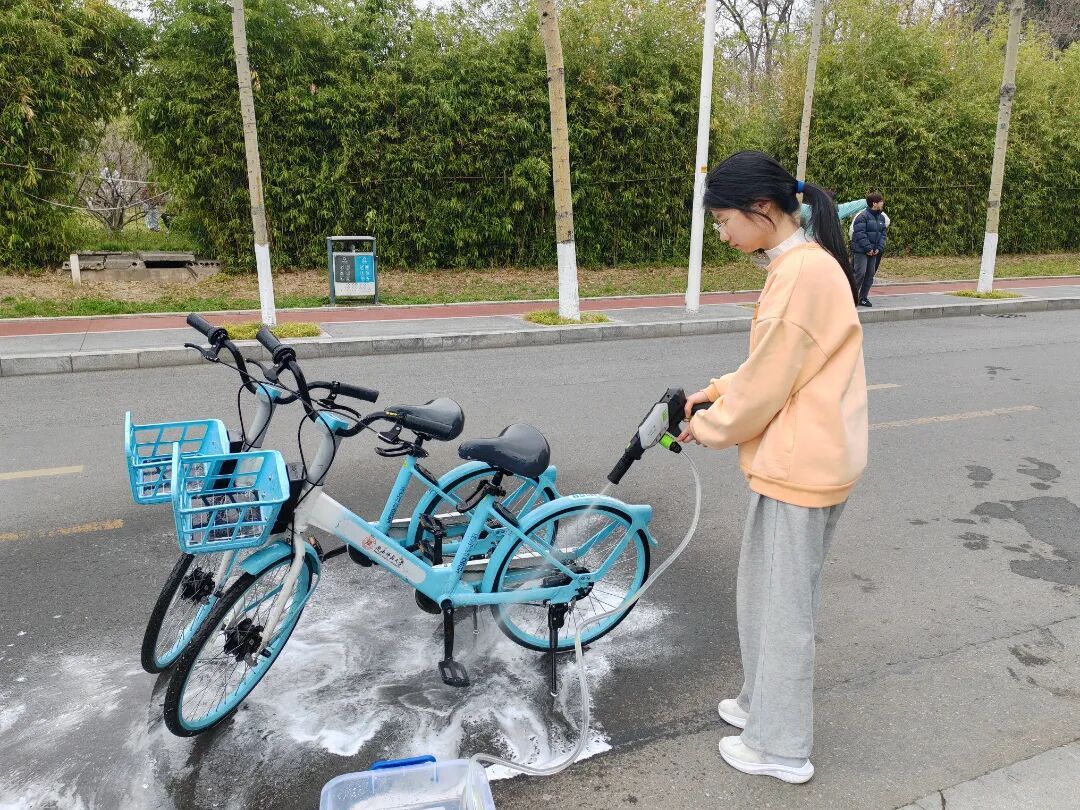 3月8日,志愿者们化身校园“美容师”,积极投身于共享单车清洗整理行动。他们手持冲水枪,仔细冲刷车身污渍、擦拭车筐灰尘,不放过每一处卫生死角;同时将随意停放的单车有序归位、摆放整齐,让原本杂乱的停车区域变得井然有序。