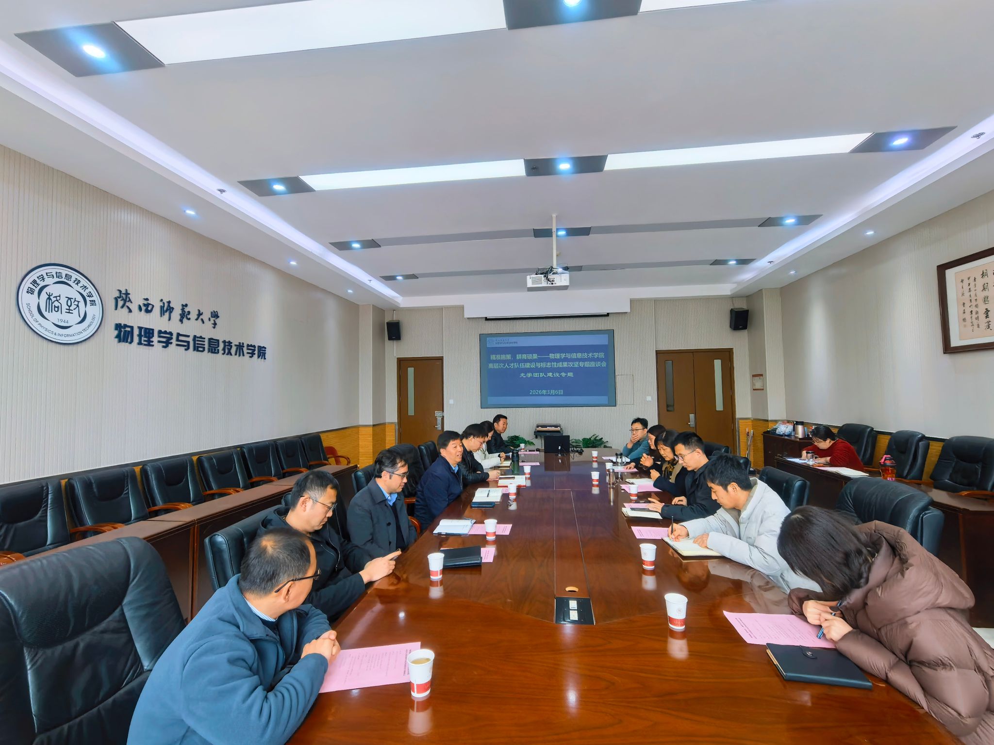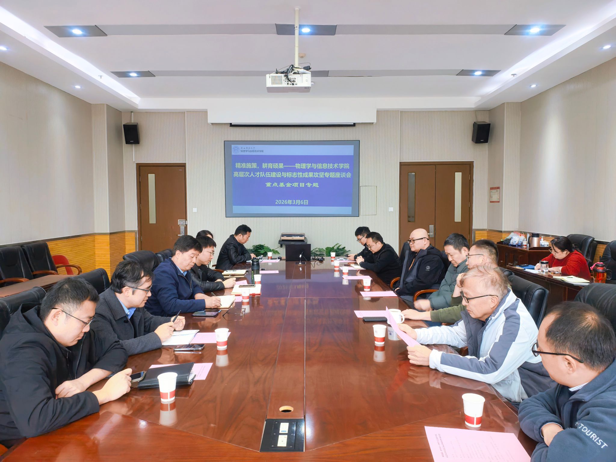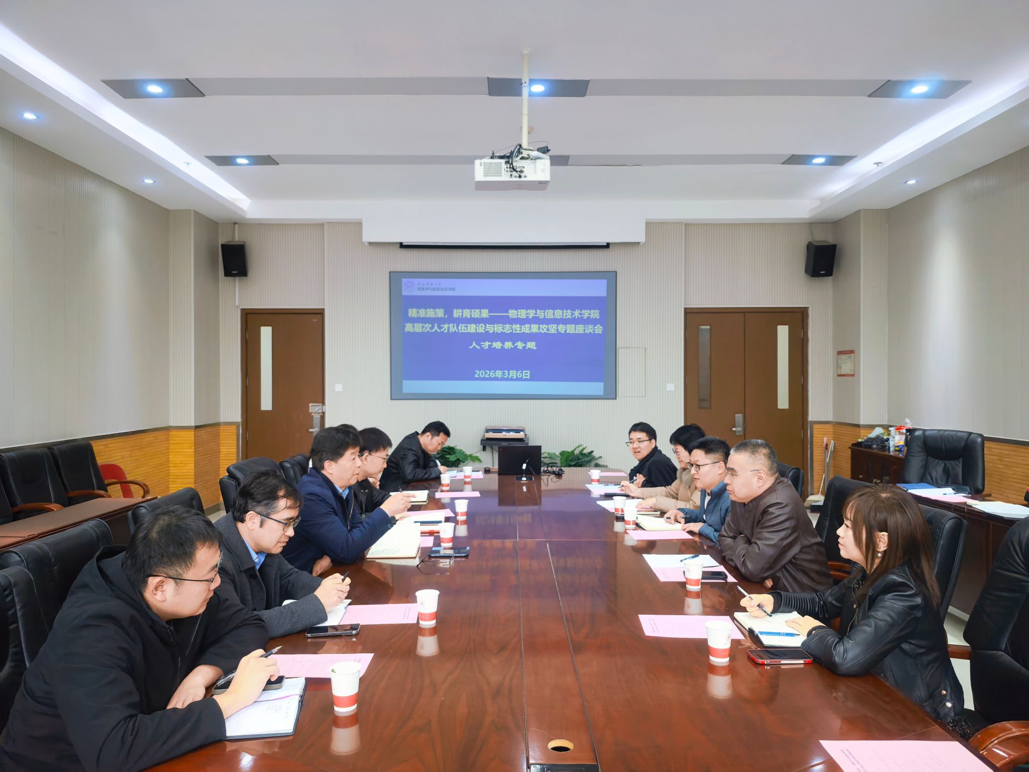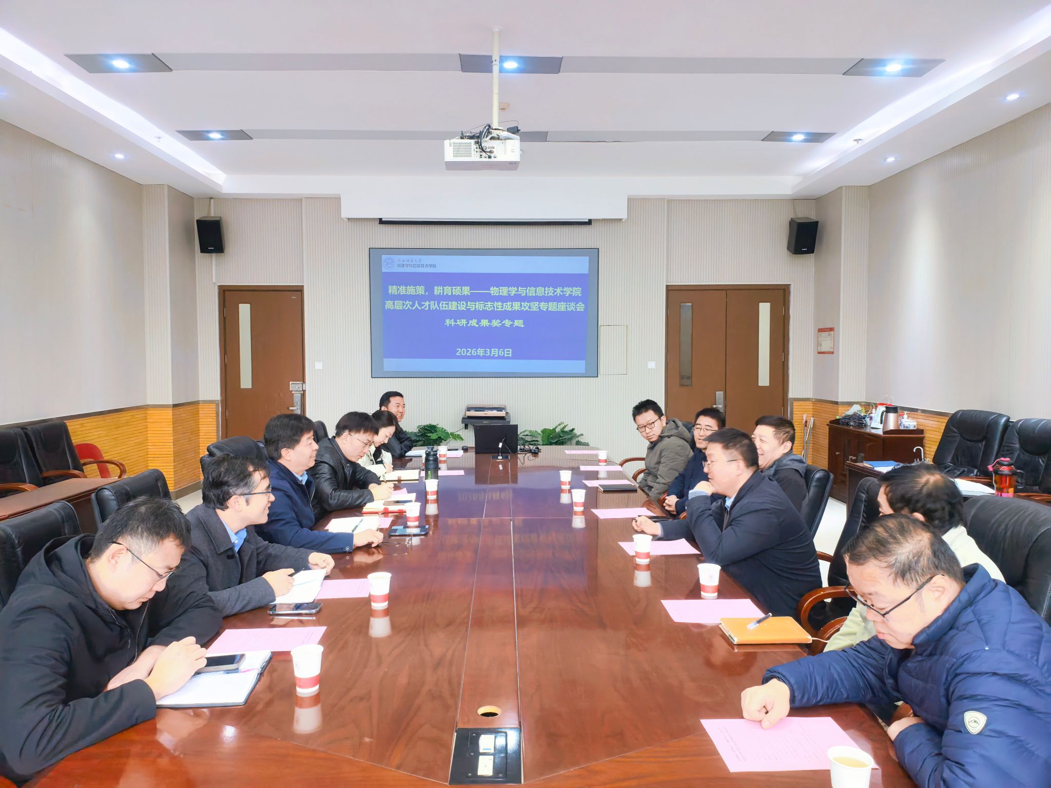 2026年3月6日,物理学与信息技术学院在致知楼三层会议室召开高层次人才队伍建设与标志性成果攻坚专题座谈会。学院班子成员、相关学科和团队负责人及教师代表三十余人参加会议,会议聚焦“十五五”开局之年重点工作,围绕人才培养、科研成果培育、重点基金项目申报、团队建设等四大专题进行深入研讨。座谈会由学院党委书记王启明主持。
